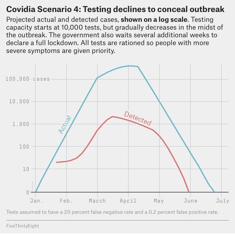 Πρέπει να σημειώσω ότι αυτό είναι περισσότερο ένα «πείραμα σκέψης» από τα άλλα τρία σενάρια. Χώρες από την Κίνα μέχρι τη Ρωσία και το Ιράν έχουν κατηγορηθεί ότι δημοσίευσαν αναξιόπιστες επίσημες στατιστικές – αλλά δεν γνωρίζω εάν ορισμένες χώρες περιορίζουν σκοπίμως τα τεστ για να περιορίσουν αυτές τις «υποθέσεις».