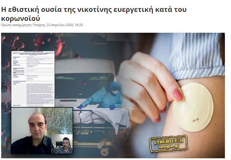 Δύο μελέτες που δημοσιεύθηκαν σήμερα 23/5 από Έλληνες επιστήμονες ρίχνουν περισσότερο φως στις πιθανές δράσεις της νικοτίνης στη λοίμωξη από τον κορωνοϊό. Η πρώτη, που πραγματοποιήθηκε από επιστήμονες του Εργαστηρίου Μοριακής Βιολογίας και Ανοσολογίας του Πανεπιστημίου Πατρών και δημοσιεύτηκε στο επιστημονικό περιοδικό European Respiratory Journal, αξιολόγησε 11 δημοσιεύσεις με συνολικά 11654 νοσηλευμένους ασθενείς με COVID-19 από την Κίνα και τις ΗΠΑ. Διαπιστώθηκε ότι ο αριθμός των καπνιστών μεταξύ των ασθενών ήταν το 1/5 του αναμενόμενου αριθμού με βάση τα ποσοστά καπνίσματος στον πληθυσμό.