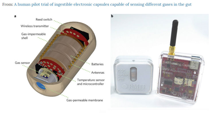 Ερευνητές στην Αυστραλία πραγματοποίησαν σε ανθρώπους την πρώτη κλινική δοκιμή μιας πρωτοποριακής ηλεκτρονικής κάψουλας που καταπίνεται και, χάρη στους αισθητήρες της, μετρά σε πραγματικό χρόνο τα αέρια του εντέρου (υδρογόνο, οξυγόνο, διοξείδιο άνθρακα κ.ά.).