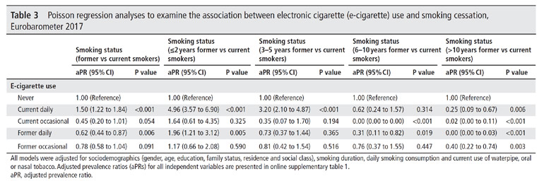 Από την έρευνα φαίνεται λοιπόν ότι η χρήση ηλεκτρονικού τσιγάρου 5πλασιαζει την πιθανότητα να έχει κόψει κάποιος το τσιγάρο τα τελευταία 2 χρόνια, και 3πλασιαζει την πιθανότητα να έχει κόψει το τσιγάρο τα τελευταία 2-5 χρόνια.