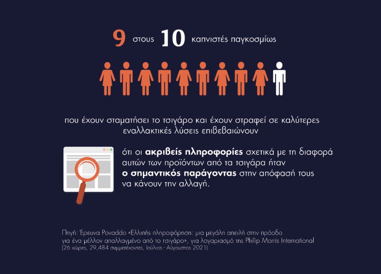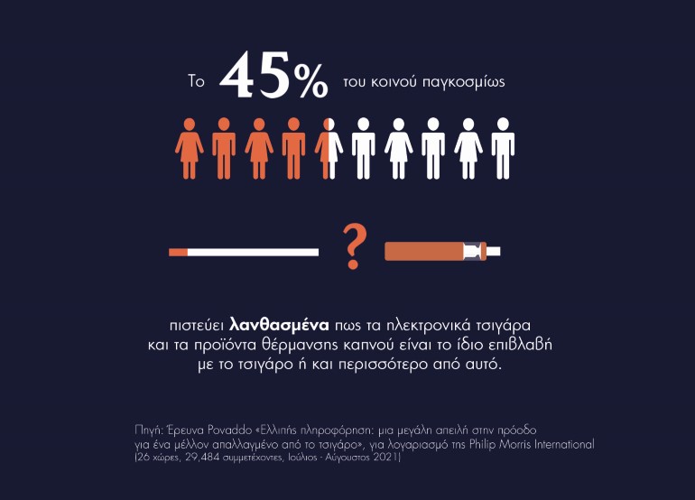 Έλλειψη ενημέρωσης φαίνεται να έχει η κοινή γνώμη και ειδικότερα οι καπνιστές για τους λόγους που το τσιγάρο είναι επιβλαβές για την υγεία, καθώς και για τις διαφορές που έχει από τα εναλλακτικά του καπνίσματος προϊόντα. Τα συμπεράσματα αυτά προκύπτουν από τη νέα διεθνή έρευνα της ανεξάρτητης εταιρείας Povaddo που έγινε για λογαριασμό της Philip Morris International με τη συμμετοχή 29.484 ενηλίκων από 26 χώρες, μεταξύ των οποίων  και η Ελλάδα.