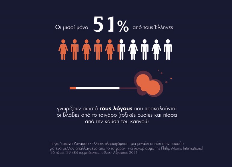 Η έρευνα με τίτλο «Ελλιπής πληροφόρηση: μια μεγάλη απειλή στην πρόοδο για ένα μέλλον απαλλαγμένο από το τσιγάρο» (Misinformation: A major threat to smoke-free progress) δείχνει συγκεκριμένα πως όταν το κοινό στην Ελλάδα κλήθηκε να προσδιορίσει την κύρια αιτία ασθενειών που σχετίζονται με το κάπνισμα, μόλις το 18% αναγνώρισε σωστά το υψηλό επίπεδο τοξικών ουσιών και το 33% την πίσσα που προκαλούνται από την καύση του καπνού. Ακόμη μικρότερο είναι το ποσοστό (41%) στο παγκόσμιο δείγμα όσων απάντησαν σωστά (δηλαδή, τοξικές ουσίες και πίσσα από την καύση του καπνού) σε αυτή την ερώτηση.