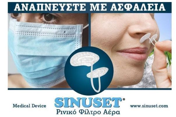 Ιδιαίτερα τις μέρες που η καλοκαιρινή ατμόσφαιρα της χώρας μας επηρεάζεται από την αφρικανική σκόνη, η προστασία της μύτης είναι απολύτως αναγκαία και η χρήση του SinuSet® αποτελεί σύγχρονη επιλογή καθώς ενώ φιλτράρει τον εισπνεόμενο αέρα ταυτόχρονα επιτρέπει την ασφαλή και ευχάριστη επικοινωνία μεταξύ των ανθρώπων χωρίς να κρύβει τα χαρακτηριστικά του προσώπου.