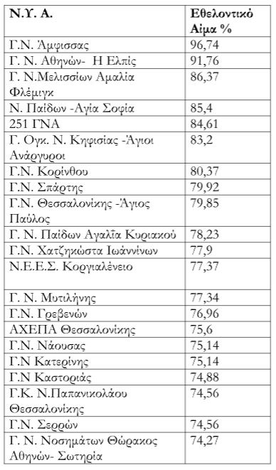 Με κριτήριο το ποσοστό του Εθελοντικού αίματος που συλλέγουν, τα είκοσι νοσοκομεία με τις καλύτερες επιδόσεις είναι: