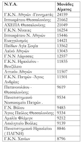 Έτσι τα δέκα πέντε καλύτερα νοσοκομεία . με κριτήριο τον αριθμό των μονάδων αίματος που συλλέγουν , είναι τα κάτωθι: