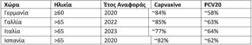 Αξίζει να σημειωθεί ότι, τα δεδομένα για τις επιλεγμένες χώρες βασίζονται στη συμμετοχή τους στην ΕΕ, το μέγεθος του πληθυσμού και το πιο πρόσφατο έτος αναφοράς. Οι τιμές αυτές προέρχονται από εθνικά επιδημιολογικά δεδομένα και ενδέχεται να υπάρχουν περιφερειακές διαφοροποιήσεις. Δεν αντικατοπτρίζουν την αποτελεσματικότητα των αντίστοιχων εμβολίων και δεν υπάρχουν μελέτες που να συγκρίνουν την αποτελεσματικότητα του CAPVAXIVE με αυτή του PCV20.