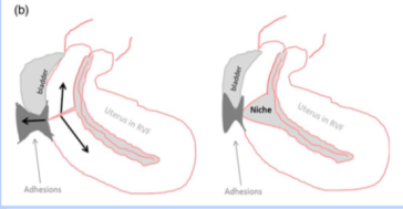 Ο τρόπος επούλωσης της καισαρικής τομής στο σημείο της μήτρας, είναι πολυπαραγοντικός και περιλαμβάνει τις συνθήκες κάτω από τις οποίες έγινε η καισαρική, τον τρόπο συρραφής της μήτρας (δηλ. τα ράμματα που έχουν χρησιμοποιηθεί και το είδος συρραφής) και τις τοπικές συνθήκες επούλωσης οι οποίες είναι απρόβλεπτες και διαφέρουν από γυναίκα σε γυναίκα. Επιπλέον, παράγοντας κινδύνου είναι η οπίσθια κάμψη της μήτρας (μήτρα με κλίση προς τα πίσω).