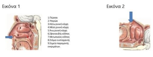 Ακριβώς η ίδια φιλοσοφία είναι και με τις ρινοπλύσεις. Οποιαδήποτε συσκευή χρησιμοποιούμε (αμπούλα, σύριγγα, ή άλλα συστήματα ρινοπλύσεων), η φορά του νερού θα είναι όπως αυτή του βέλους της εικόνας 1, για να κατευθύνει το νερό στο σημείο 9 που λιμνάζουν οι εκκρίσεις. Σε καμία περίπτωση δεν ασκούμε μεγάλη πίεση για να γίνει ο καθαρισμός, διότι πίσω από το σημείο 9, είναι το ανατομικό σημείο 8, που είναι το στόμιο της ευσταχιανής σάλπιγγας η οποία ενώνει τη μύτη του παιδιού με το αυτί. Η μεγάλη πίεση στη ροή του νερού, μπορεί να διανοίξει την ευσταχιανή, να περάσει νερό στο μέσο αυτί, να πονέσει το παιδί, να μετακινηθεί το τύμπανο προς τα έξω, να παραμείνει υγρό στο μέσο αυτί, ακόμα και να προκαλέσει στο παιδί συχνές ωτίτιδες.
