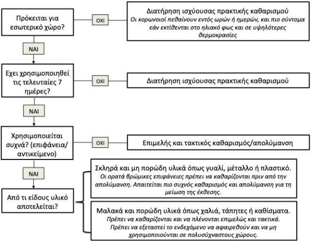 Οι καθηγητής της Ιατρικής Σχολής του Εθνικού και Καποδιστριακού Πανεπιστήμιου Αθηνών Βίκυ Μπενέτου, Ιωάννης Ντάνασης, Μαρία Γαβριατοπούλου, Δημήτρης Παρασκευής, Νίκος Θωμαϊδης και Θάνος Δημόπουλος συνόψισαν τις ειδικές οδηγίες για τον καθαρισμό και την απολύμανση δημόσιων χώρων, χώρων εργασίας, επιχειρήσεων, σχολείων και σπιτιών κατά την επάνοδο στην κανονικότητα που εξέδωσε το Κέντρο Ελέγχου Νοσημάτων (CDC) των ΗΠΑ, σε συνεργασία με την Υπηρεσία Περιβαλλοντικής Προστασίας των ΗΠΑ