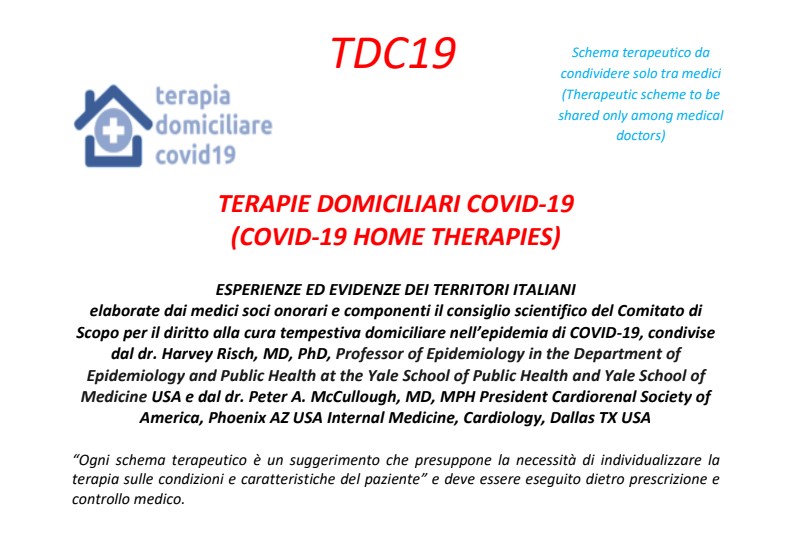 Στη δημοσιότητα έδωσαν Ιταλοί γιατροί προς χρήση και από άλλους γιατρούς, εφόσον το επιθυμούν, συγκεκριμένο θεραπευτικό πρωτόκολλο το οποίο, σύμφωνα με την εμπειρία τους, λειτουργεί σε ασθενείς με Covid-19 στο σπίτι. Πρόκειται, όπως υποστηρίζουν, για θεραπεία η οποία εφαρμόζεται στο σπίτι με την παρακολούθηση κάποιου γιατρού, με σκοπό ο ασθενής από την πρώτη στιγμή να θεραπευτεί και να μη χρειαστεί να νοσηλευτεί. Το συγκεκριμένο πρωτόκολλο υπογράφουν 200 Ιταλοί γιατροί από διάφορες περιοχές, μεταξύ των οποίων και γιατροί του εθνικού συστήματος υγείας της γειτονικής χώρας. Επίσης το πρωτόκολλο αυτό μοιράζονται και επιστήμονες των ΗΠΑ, όπως ο Harvey Risch, καθηγητής Επιδημιολογίας στο Πανεπιστήμιο του Γέιλ, καθώς και ο καθηγητής Ιατρικής στο Ντάλας, Peter A. McCullough.