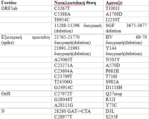 Τα στελέχη της ομάδας Β.1.1.7 έχουν ασυνήθιστα υψηλό αριθμό μεταλλαγών ιδιαίτερα στην περιοχή της εξωτερικής πρωτεΐνης (spike).
