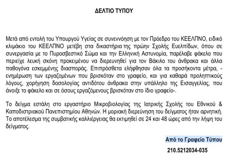 Μετά από εντολή του υπουργού Υγείας σε συνεννόηση με τον Πρόεδρο του ΚΕΕΛΠΝΟ, ειδικό κλιμάκιο του ΚΕΕΛΠΝΟ μετέβη στα δικαστήρια της πρώην Σχολής Ευελπίδων, όπου σε συνεργασία με το Πυροσβεστικό Σώμα και την Ελληνική Αστυνομία, παρέλαβε φάκελο που περιείχε λευκή σκόνη προκειμένου να διερευνηθεί για τον Βάκιλο του άνθρακα και άλλα παθογόνα εσκεμμένης διασποράς.