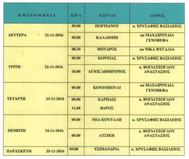 Το πρόγραμμα των επισκέψεων αγροτικών ιατρών στα περιφερειακά ιατρεία οικισμών της Λήμνου για την προσεχή εβδομάδα (21-25 Νοεμβρίου) ανακοίνωσε το νοσοκομείο του νησιού.