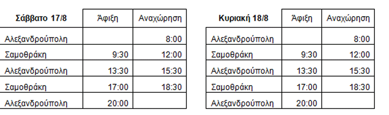 Η εταιρεία SEAJETS ανακοίνωσε σήμερα ότι, σε συνεννόηση με τον υπουργό Ναυτιλίας, Γιάννη Πλακιωτάκη, και την κυβέρνηση, θα επεκτείνει τα έκτακτα δρομολόγια της ακτοπλοϊκής σύνδεσης της Σαμοθράκης με την Αλεξανδρούπολη το Σάββατο 17/8 και την Κυριακή 18/8 με το επιβατηγό οχηματαγωγό ταχύπλοο «ANDROS JET».