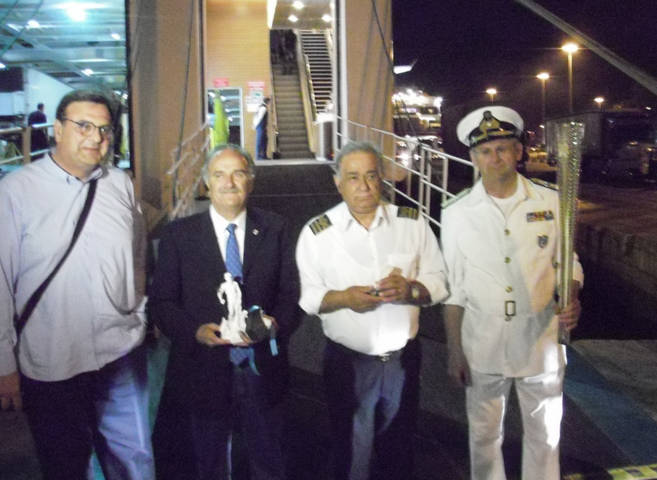 Η Ολυμπιακή Φλόγα που είχε ανάψει λίγες ώρες νωρίτερα στον ιερό χώρο της Αρχαίας Ολυμπίας, έφτασε στο λιμάνι του Πειραιά, χθες το βράδυ, στις 9:30 μμ. Στον καταπέλτη του πλοίου την υποδέχθηκαν ο πλοίαρχος του ΕΛΥΡΟΣ καπετάν Μπάμπης Πετράς, ο Αρχηγός του Λιμενικού Σώματος Αντιναύαρχος Σούλης Κωνσταντίνος, ο Κεντρικός Λιμενάρχης Πειραιά Αρχιπλοίαρχος Λ.Σ. Μπατσολάκης Ιωάννης και Ανώτατοι Αξιωματικοί του πλοίου.