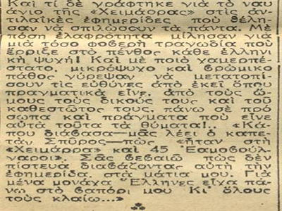 Με αφορμή τα 100 χρόνια από το ναυάγιο του Τιτανικού, το zouglaport, θυμάται το μεγαλύτερο ναυάγιο στην σύγχρονη ελληνική ιστορία. Πρόκειται για το πλοίο “Χειμάρρα” που εκτελούσε το δρομολόγιο Θεσσαλονίκη-Πειραιάς κι έγινε “υγρός τάφος” για 400 ψυχές που επέβαιναν σε αυτό.