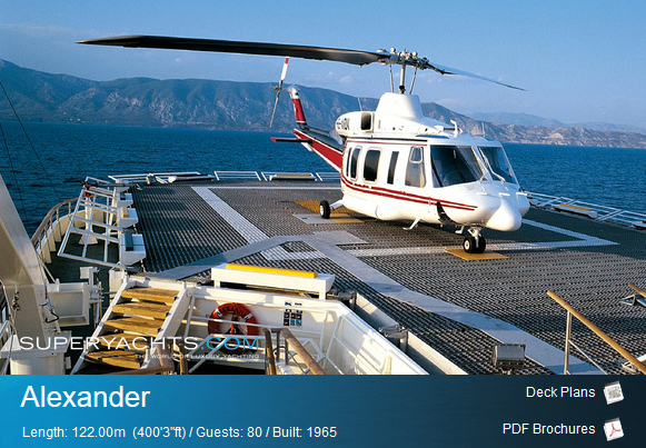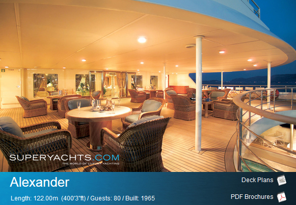 Η μήκους 121,95 μέτρων θαλαμηγός, του ομίλου Λάτση (mega yacht Alexander) φέρεται να πωλείται με ζητούμενη τιμή περί τα 35 εκατ. ευρώ, σύμφωνα με την ιστοσελίδα SUPERYACHTS.COM.