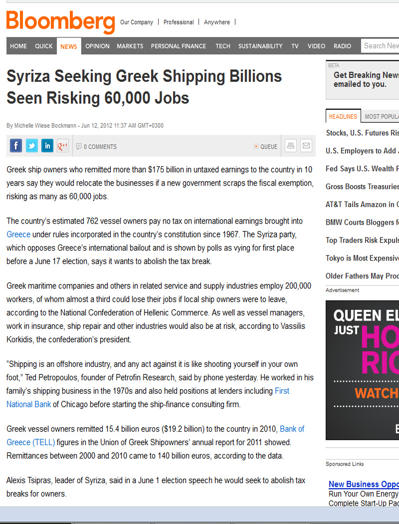 Προειδοποίηση απευθύνουν οι Έλληνες εφοπλιστές μέσω του Bloomberg, πως εάν εκλεγεί κυβέρνηση που θα αρνηθεί το μνημόνιο θα μεταφέρουν τις επιχειρήσεις τους στο εξωτερικό. Αυτό θα έχει ως συνέπεια να χαθούν έως 60.000 θέσεις εργασίας του ναυτιλιακού κλάδου.
