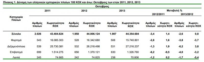 Σύμφωνα με αυτήν η δύναµη του Ελληνικού Εµπορικού Στόλου, από πλοία 100 ΚΟΧ και άνω, το µήνα Οκτώβριο παρουσίασε µείωση κατά 2,6% σε σχέση με τον Οκτώβριο του 2012. Υπενθυμίζεται ότι μεταξύ Οκτωβρίου 2012 και Οκτωβρίου 2013 ο Ελληνικός Εμπορικός Στόλος είχε μειωθεί 3,4%.