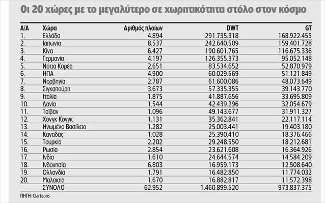 Την πρώτη θέση στην παγκόσμια ναυτιλιακή αγορά καταλαμβάνει για μία ακόμη χρονιά ο ελληνόκτητος στόλος με βάση υπολογισμού τους gross tonnage (gt) ή τους dead weight tones (dwt), σύμφωνα με το βρετανικό ναυλομεσιτικό οίκο Clarkson.