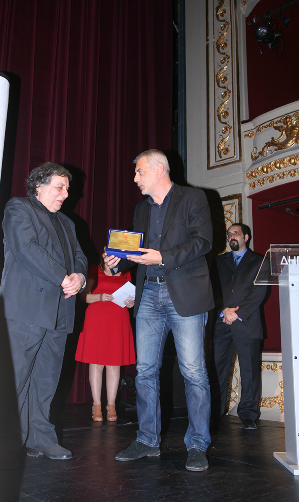 Στο κατάμεστο Δημοτικό Θέατρο, ο Δήμαρχος Πειραιά κ. Γιάννης Μώραλης προσέφερε στον Πειραιώτη συγγραφέα αναμνηστική πλακέτα, τονίζοντας μεταξύ άλλων στον σύντομο χαιρετισμό του: