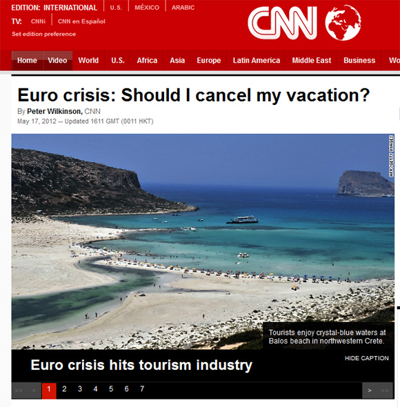 Τώρα, καθώς οι φόβοι αυξάνονται για το αν η Ελλάδα θα παραμείνει στο ευρώ, και το ενδεχόμενο ντόμινο που αυτό θα μπορούσε να προκαλέσει, πολλοί υποψήφιοι παραθεριστές φαίνεται να έχουν δεύτερες σκέψεις σχετικά με την επίσκεψη τους όχι μόνο στην Ελλάδα αλλά και στις άλλες οικονομικά προβληματικές χώρες- μέλη της ευρωζώνης, όπως η Ισπανία ή η Πορτογαλία.