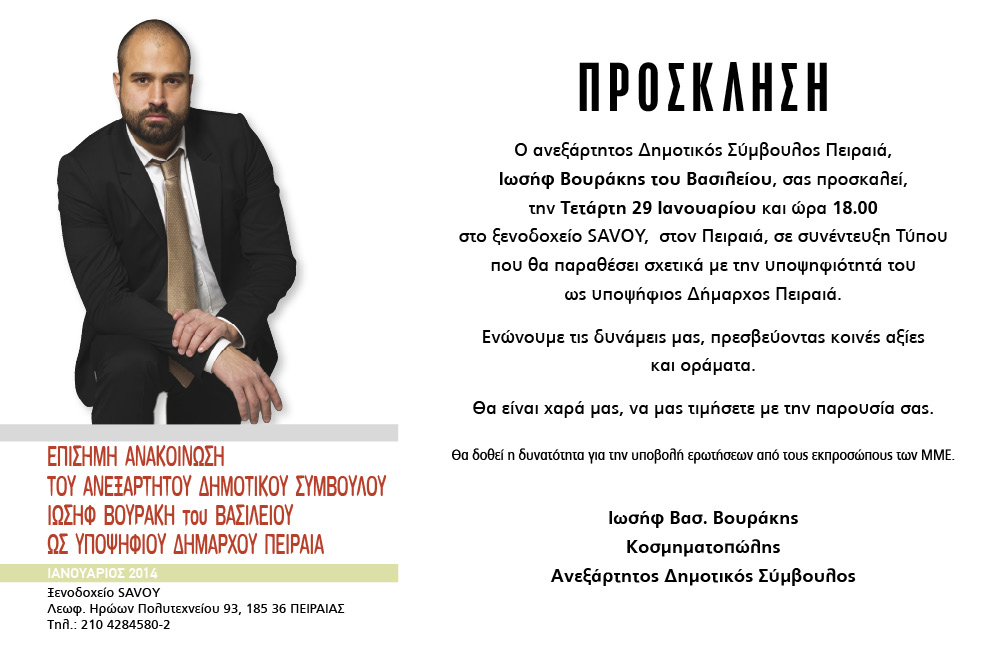 Την Τετάρτη 29 Ιανουαρίου, ο ανεξάρτητος Δημοτικός Σύμβουλος Πειραιά Ιωσήφ Βουράκης, θα παραχωρήσει συνέντευξη τύπου στο ξενοδοχείο SAVOY , όπου θα αναλύσει τις σκέψεις και το όραμα που έχει για την Πόλη.