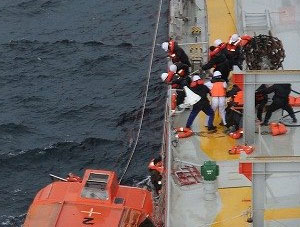 Το σφυροκόπημα συνεχίζεται. Σκάμε πάνω στο πλοίο. Τα ελάχιστα δευτερόλεπτα που μένουμε εκεί, πρέπει να πιάσεις την ανεμόσκαλα και να ανέβεις τουλάχιστον πέντε σκαλοπάτια. Αν αργήσεις, σε βρίσκει η βάρκα και σε λειώνει πάνω στο πλοίο. Κάποιος αποφασίζει να το κάνει. Δεν μπορεί. Άργησε. Βρέθηκε ανάμεσα. Δεν τον ξαναείδαμε.
