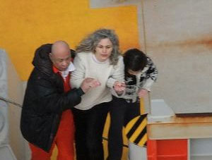 Όταν έρχεται μικρό φωνάζει, τώρα τώρα, ο Francesco και δυο ακόμη, πιάνουν την ανεμόσκαλα και πρέπει να φύγεις γρήγορα. Κάθε φορά που προσπαθεί κάποιος είμαστε όλοι βουβοί. Ο Ιερέας πιάνει την ανεμόσκαλα, ο Γιώργης του λέει τώρα, ο Ιερέας διστάζει, φύγε, του φωνάζουν, φύγε, ο Ιερέας ανεβαίνει ένα σκαλοπάτι και μένει εκεί. Η βάρκα μας σηκώνεται απ’ το επόμενο μεγάλο κύμα και σκάει πάνω στο πλοίο. Στην ανεμόσκαλα δεν είναι κανείς. Κι όμως η διαδικασία συνεχίζεται. Χωρίς λεπτό χαμένο (Αυτό ήταν ήταν σοκαριστικό για όλους. Το ότι δε νοιώθαμε τίποτα. Ο επόμενος). Η επόμενη ήταν μια κυρία. Η πρώτη γυναίκα που θα προσπαθούσε. Δυο προσπάθειες έκανε. Στην πρώτη δεν μπορούσε γιατί την εμπόδιζε το σωσίβιο. Στη δεύτερη τη βλέπω να το βγάζει. Πιάνω το κεφαλάκι της Αλίνας και το χαμηλώνω. Κλείνω και εγώ τα μάτια. Μπράβο μπράβο, ανέβα, της φωνάζουν. Σπάει ο πίσω κάβος και ο Γιώργης ορμάει να κόψει και τον μπροστά. Η βάρκα απομακρύνεται αλλά ο μπροστινός κάβος δεν κόβεται με το σουγιά. Η γυναίκα φαίνεται μπροστά μας πάνω στην ανεμόσκαλα. Δεύτερο, τρίτο, τέταρτο σκαλί και γλιστράει. Χάνεται στη θάλασσα κάτω απ’ το πλοίο. Κάποιος πετάει ένα σωσίβιο προς το σημείο που χάθηκε. Εμείς είμαστε δεμένοι με τον κάβο και ο Γιώργης ουρλιάζει προς το πλήρωμα για να μας ελευθερώσουν αυτοί από πάνω. TΙ ΚΑΝΕΙ Ο ΗΛΙΘΙΟΣ ΘΑ ΜΑΣ ΣΚΟΤΏΣΕΙ ΟΛΟΥΣ. ΜΑΣ ΣΤΕΛΝΕΙ ΚΑΤΩ ΑΠ ΤΗ ΠΡΥΜΝΗ. ΚΟΨΤΟ, ΑΣΤΟ ΟΥΡΛΙΑΖΑΜΕ ΟΛΟΙ Σ’ ΟΛΕΣ ΤΙΣ ΓΛΩΣΣΕΣ. Tο κόβουν και ελευθερωνόμαστε.