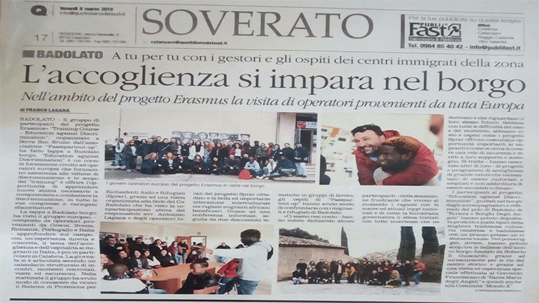 Μια χρήσιμη, ζωντανή και διαπολιτισμική εμπειρία 8 ημερών, με όχημα το “Education Against Discrimination” ( Μόρφωση κατά των διακρίσεων), έλαβε χώρα στην περιοχή Serra San Bruno της Ιταλίας, από 1-9 Μαρτίου 2019. Ήταν ένα σεμινάριο κατάρτισης, κατά τη διάρκεια του οποίου 25 εκπρόσωποι οργανώσεων από 5 ευρωπαϊκές χώρες, ανάμεσα στις οποίες και η Ελλάδα, μέσω μη τυπικών εκπαιδευτικών εργαλείων (εργαστήρια-workshops, συζητήσεις, παρουσιάσεις, διαδραστικά παιχνίδια κ.α.), ενημερώθηκαν εκτενώς για το πρόβλημα των διακρίσεων, που απορρέει από την προκατάληψη και τα στερεότυπα. Το επιμορφωτικό πρόγραμμα προσέλκυσε το ενδιαφέρον του ιταλικού Τύπου, που ασχολήθηκε εκτενώς με τα εργαστήρια – workshops των ευρωπαίων συμμετεχόντων, με καθημερινές δημοσιεύσεις, αναρτήσεις και συζητήσεις στο ραδιόφωνο.