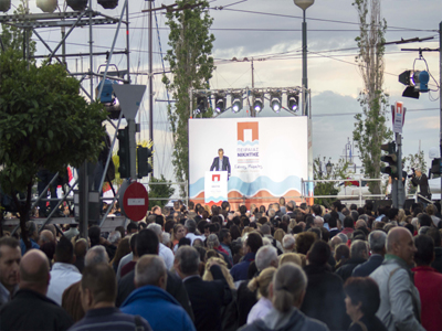 Ο νυν Δήμαρχος Βασίλης Μιχαλολιάκος έκανε τη συγκέντρωσή του στην πλατεία Κοραή, την κεντρική πλατεία της πόλης στο Δημαρχείο.