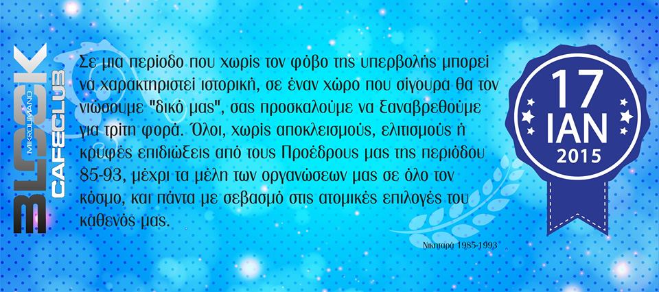 Η συνάντηση γίνεται Σάββατο 17 Ιανουαρίου στο BLOCK CLUB στον Πειραιά και αναμένονται αφίξεις ακόμα και από …επαρχία. Άλλωστε η προκήρυξη των εκλογών μάλλον δεν θα τους αφήσει να …αγιάσουν . Η πολιτική και οι εξελίξεις ,εκτός φυσικά από τις συναισθηματικές αναδρομές 85-93 ,