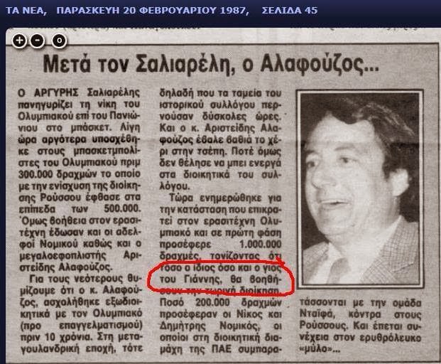 Όπως θα διαβάσετε στο φύλλο της εφημερίδας ΝΕΑ του 1987, την εποχή που ο Ολυμπιακός ξεκινούσε τα «πέτρινα χρόνια» η οικογένεια Αλαφούζου είχε βοηθήσει οικονομικά τον Ολυμπιακό, με 1 εκ. δραχμές. Μάλιστα όπως γράφει το δημοσίευμα, συμμετείχε στην βοήθεια και ο γιος του κυρ Αριστείδη, Γιάννης!