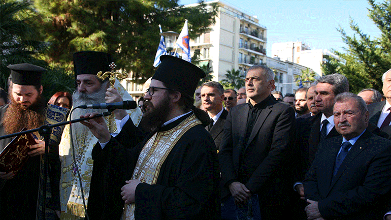 Η επιμνημόσυνη δέηση τελέστηκε στον ανδριάντα του Παναγιώτη Βλαχάκου στην πλατεία Κωνσταντίνου Καραμανλή (πρ. πλατεία Τερψιθέας), χοροστατούντος του Σεβασμιωτάτου Μητροπολίτη Πειραιώς και Φαλήρου κ.κ. Σεραφείμ, παρουσία των εκπροσώπων της κυβέρνησης, των κομμάτων, των αρχών και φορέων της πόλης.