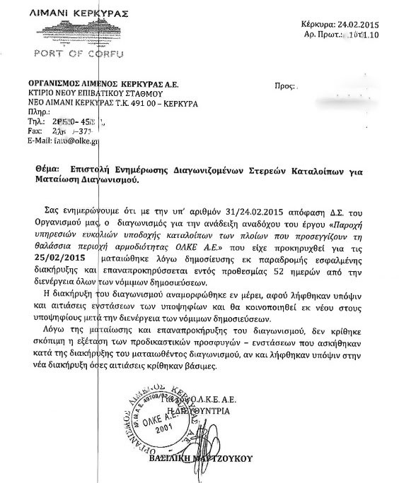 Σήμερα, με απόφαση του Δ.Σ του Οργανισμού Λιμένος Κερκύρας, ακυρώθηκε ο διαγωνισμός για την ανάδειξη αναδόχου του έργου «Παροχή υπηρεσιών ευκολιών υποδοχής καταλοίπων των πλοίων που προσεγγίζουν τη θαλάσσια περιοχή αρμοδιότητας ΟΛΚΕ ΑΕ».