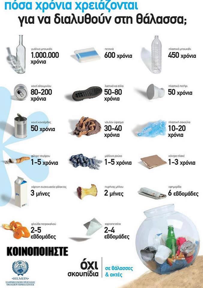 Γι’ αυτό το λόγο η Ελληνική ένωση προστασίας θαλασσίου περιβάλλοντος (HELMEPA) δημιούργησε αυτή την αφίσα, που κυκλοφορεί σε όλα τα social media, με στόχο να δείξει στο κοινό τον καιρό που χρειάζονται τα σκουπίδια για να αποσυντεθούν.