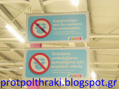 Καταγγέλλουμε με αγανάκτηση, την προκλητική ενέργεια της εταιρείας Jumbo, να χρησιμοποιήσει στο νέο κατάστημά της στον Ίασμο του νομού Ροδόπης, σε όλες τις πινακίδες (και στις από μεγαφώνου ανακοινώσεις), παράλληλα με την ελληνική και την τουρκική γλώσσα.