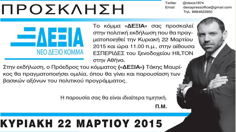 Το νέο κόμμα «ΔΕΞΙΑ» και ο πρόεδρός του Τάκης Μαυρίκος κάνει την πρώτη του δημόσια εμφάνιση την ερχόμενη Κυριακή στο ξενοδοχείο Hilton.