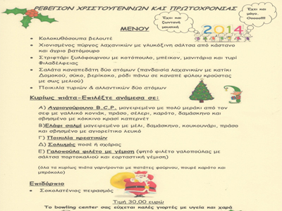 Κολοκυθόσουπα βελουτέ, χιονισμένο πύργο λαχανικών με γλυκόξινη σάλτσα από κάστανο και άγριο βατόμουρο, στριφτάρι ξυλόφουρνου με κοτόπουλο μπέικον μανιτάρια και τυρία, σαλάτα καναπεδάτη δύο ατόμων, ποικιλία τυριών και αλλαντικών, να επιλέξει για κυρίως πιάτο, αγριογούρουνο με γαλλικό κονιάκ, πράσο σέλερι, καρότο δαμάσκηνο, κουκουνάρι και σβησμένο με κόκκινο καπερνέτ, ελάφι σαλμί μαγειρεμένο με μέλι, δαμάσκηνο κουκουνάρι πράσο και σβησμένο με αγιορείτικο λευκό, ποικιλία κρεατικών, σολωμό ποσέ ή σχάρας, γαλοπούλα φιλέτο με γέμιση και για επιδόρπιο έναν …σοκολατένιο πειρασμό!
