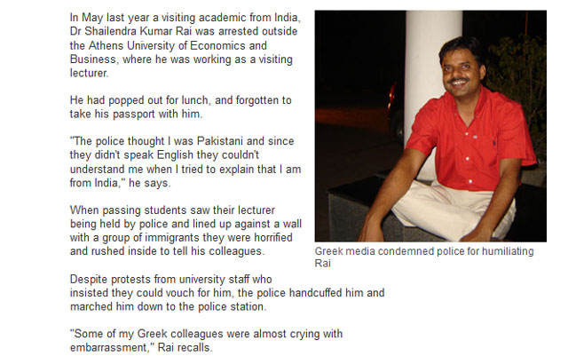 Το βρετανικό δίκτυο επισημαίνει ότι τα θύματα της αστυνομικής βίας δεν εξαντλούνται μόνο στους τουρίστες, «θυμίζοντας» την περίπτωση του δρ Σαϊλέντρα Κουμάρ Ράι, ο οποίος συνελήφθη ως μετανάστης χωρίς χαρτιά έξω από το Οικονομικό Πανεπιστήμιο της Αθήνας όπου εργαζόταν ως λέκτορας, η περίπτωση του οποίου είχε προκαλέσει «την κατακραυγή των ελληνικών μέσων ενημέρωσης», όπως αναφέρει το BBC.